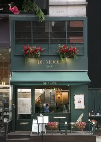 한 카페의 외관을 보면 입구 벽면 전체가 그린 톤으로 가득 채운 공간을 제공합니다.