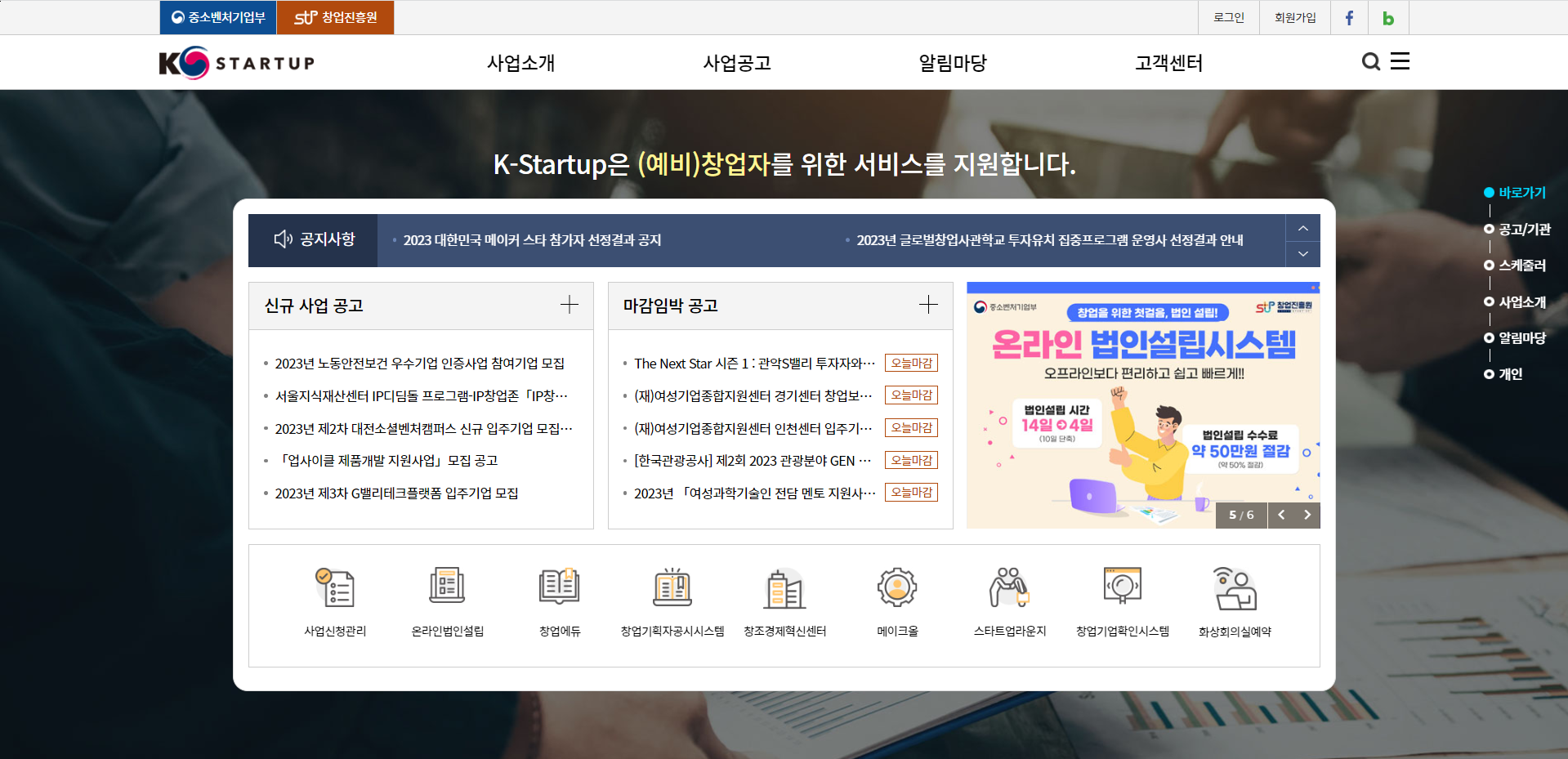 중소벤처기업부 운영 창업지원포털 창업지원사업 정보 통합·제공 및 온라인창업교육, 창업공간정보, 온라인법인설립 서비스 제공